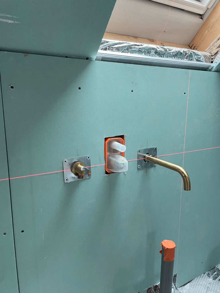 Pour garantir la résistance à l’humidité, nous avons mis en place du placo hydrofuge sur l’ensemble des cloisons. Un ragréage fibré a aussi été réalisé pour niveler parfaitement le sol avant la pose du carrelage.