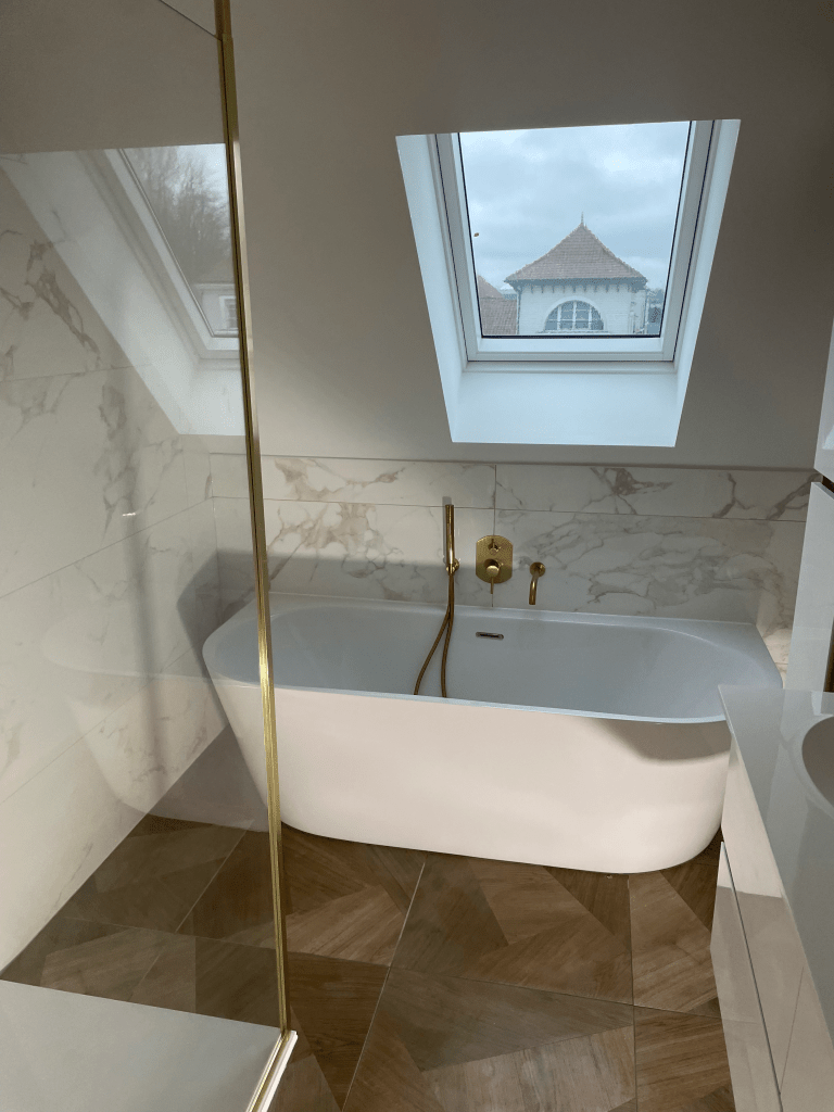 Le cœur de la pièce : une somptueuse baignoire semi-ilot, installée avec précision pour s’intégrer harmonieusement dans l’espace. Elle invite à la détente et donne une dimension esthétique supérieure à la salle de bain.