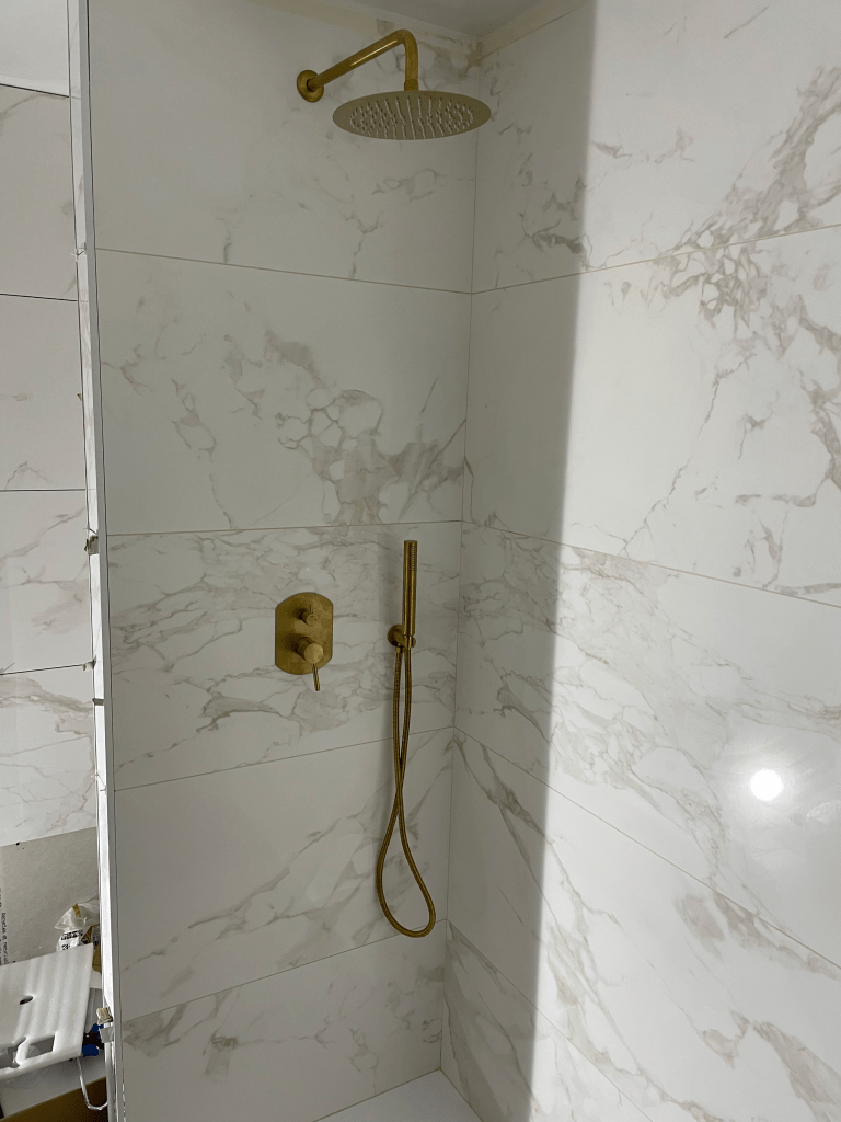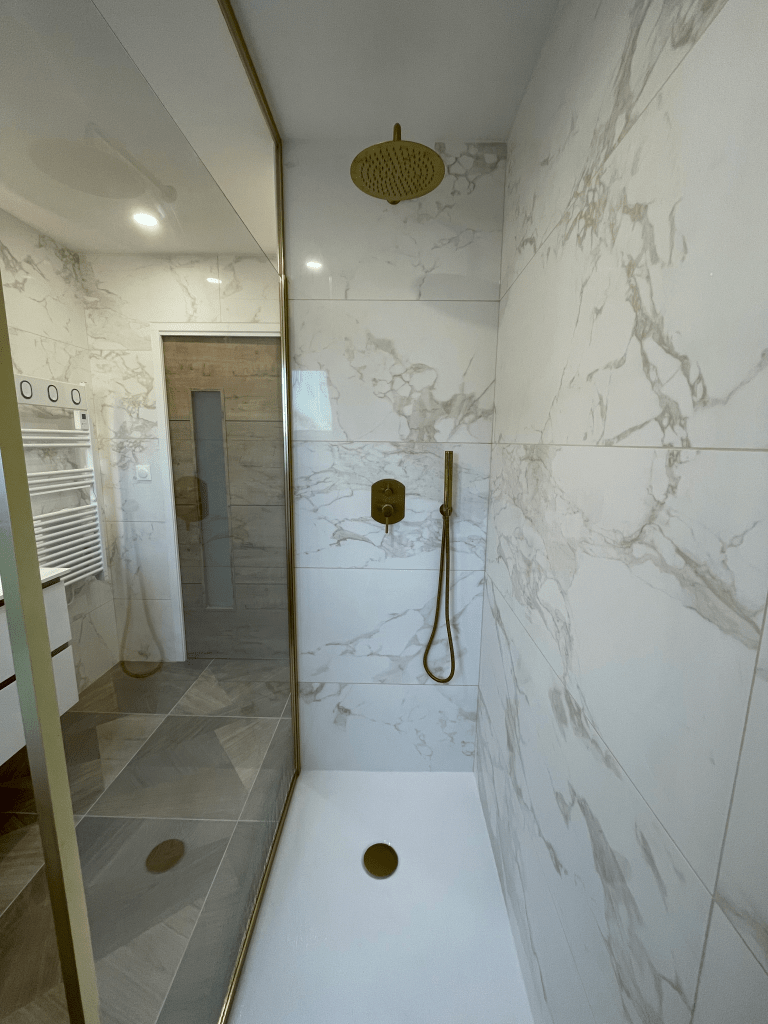 Au sol des carreaux 60×60, assurant robustesse et modernité, tandis que les murs se parent de carreaux grand format 120×60 pour une sensation d’espace et un rendu visuel haut de gamme. La pose précise garantit un alignement parfait et des finitions nettes.
